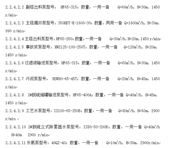 請?zhí)峁┈F(xiàn)有脫硫主塔及副塔吸收段漿液泵、工藝水泵的規(guī)格、型號、材質(zhì)、數(shù)量,及現(xiàn)有設(shè)備的清冊。